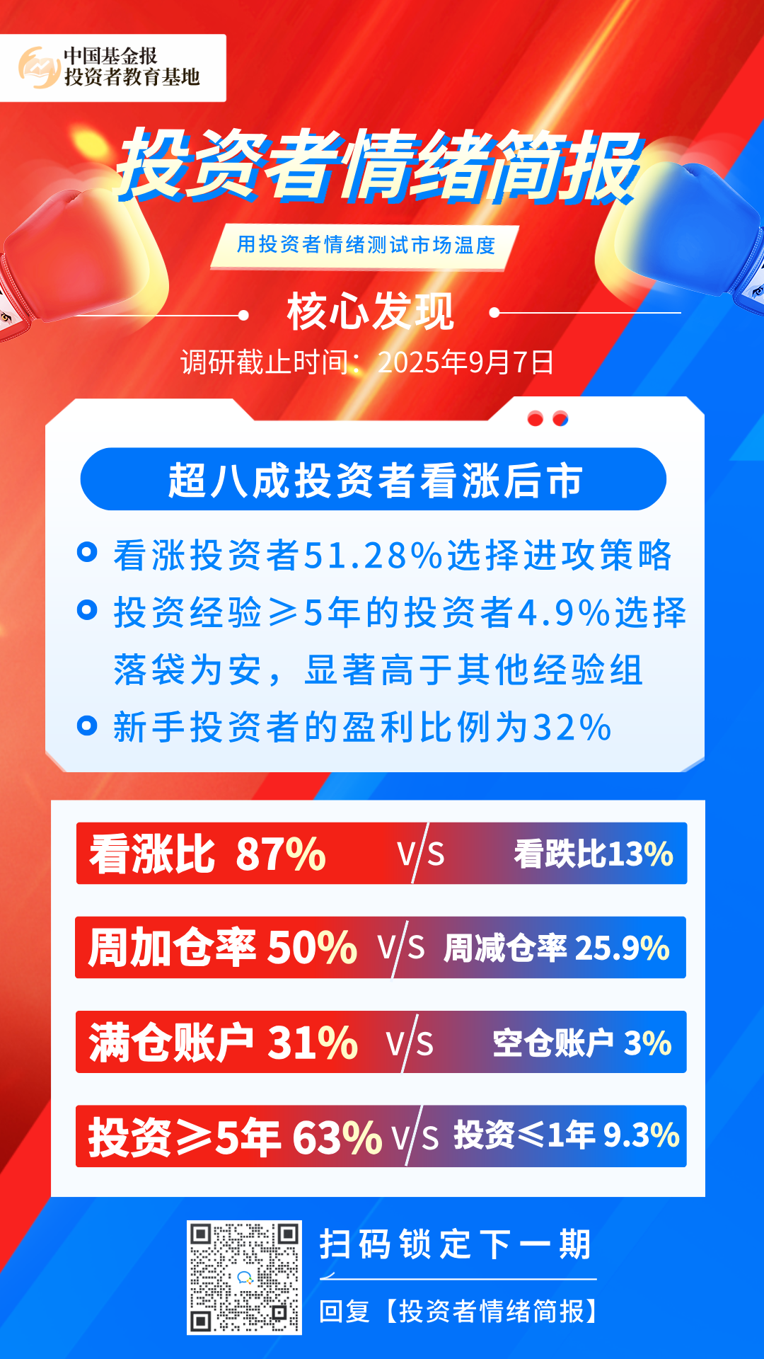 ]article_adlist--> 中国基金报《投资者情谊简报》]article_adlist--> 9月5日至7日,咱们在3万+投资者讲明社群发起调研,聚焦短期预期、行为信号、风险偏好、盈亏压力四大中枢维度,动态揭示市集底层的共鸣与不对。《中国基金报》对本平台所刊载的原创执行享有著述权,未经授权退却转载,不然将讲究法律牵涉。