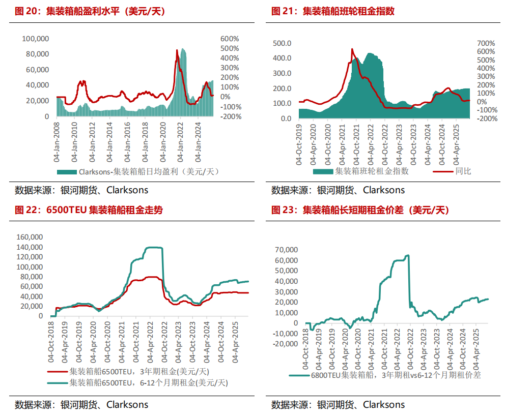 从盈利水平来看,9月集运市集租船市集热度稍降,日均盈利水平出现小幅回落,但瑕瑜期房钱水平依旧看护高位。具体来看,9月集装箱日均盈利为46487好意思金/天,环比8月底-0.06%。罢休2025年9月19日当周,6500TEU集装箱3年房钱为47500好意思金/天,环比捏平,同比+3.3%;6500TEU集装箱6-12个月房钱为70500好意思金/天,同比+8.5%。