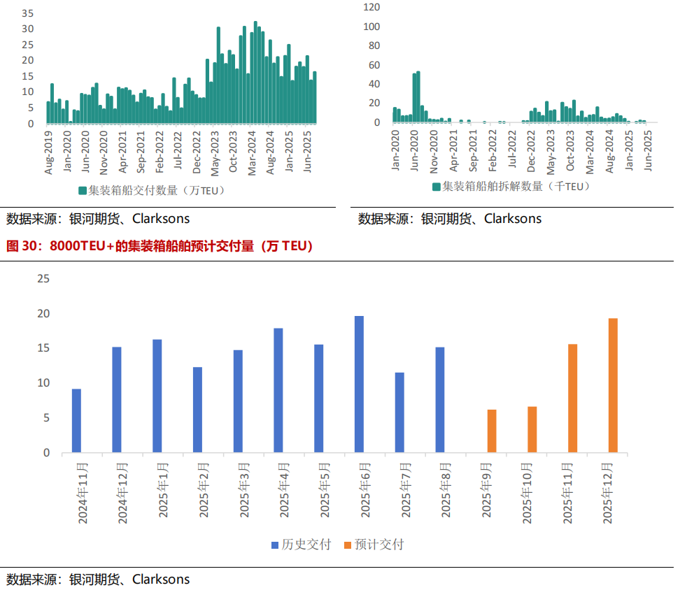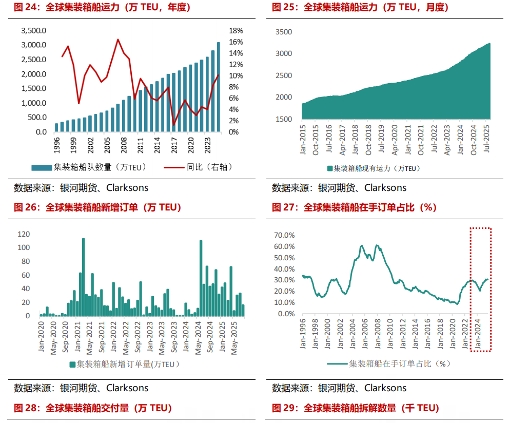 供应方面,8月大家集装箱新船委用16.33万TEU,环比+19.3%,同比-37.2%。再行增订单量来看,2025年8月集装箱新增订单量27艘,共计16.2万TEU,环比-51.5%,同比-77.8%。从当今的集装箱订单结构来看,1.2万TEU以上的船型占据主要隘位,商酌从2026年起,将再次迎来船舶的委用岑岭。
