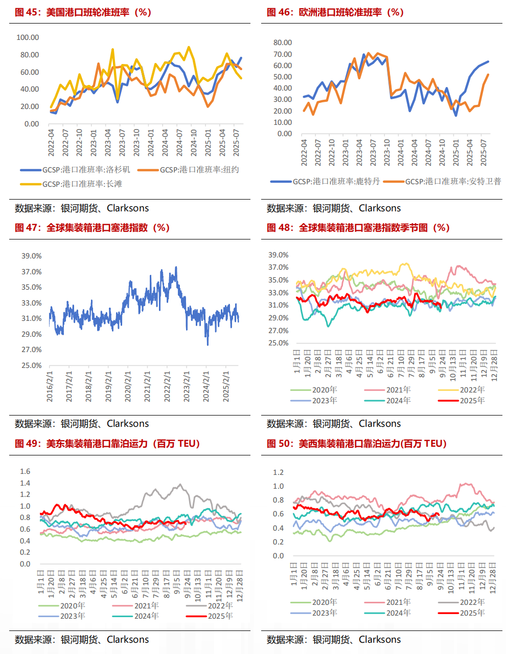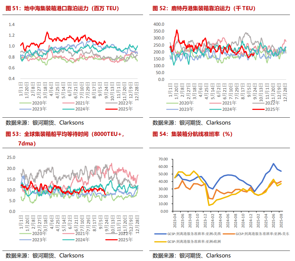 大家港口情况看护领略,9月集运市集步入传统淡季,尽管欧洲部分地区月内受到极点天气导致的港口拥挤,但在货量缓缓回落的布景下,缓缓稀释了港口拥挤所带来的问题。合座来看,凭证Clarksons塞港指数泄露,罢休2025/9/22日,Clarksons大家集装箱船塞港指数报30.6%,较8月出现理解回落;从船舶恭候时长来看,罢休2025/9/21日,大家集装箱船(8000TEU+,7dma)的平均恭候时刻7.92个小时,较8月底减少2.7个小时。