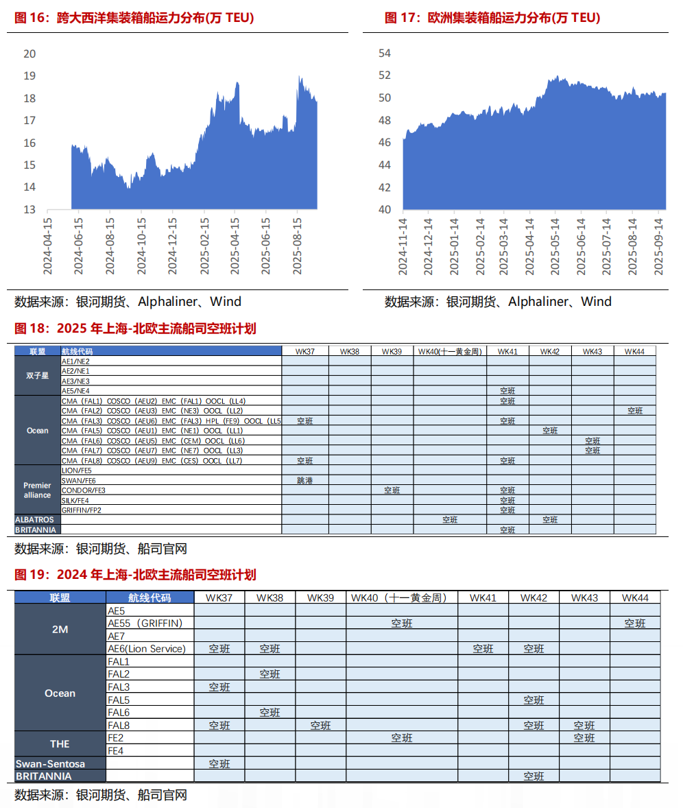 从闲置运力情况来看,9月闲置运力较上月略有加多,船司接收放慢消化富足运力,重心柔柔宣涨季船司主动空班的情况。罢休2025年9月22日,大家集装箱闲置运力共计63.3万TEU,较上月同时+1.2%,较旧年同时+4.5%。从船司的船舶班次排期来看,凭证9/22日船期表泄露,上海-北欧5港9/10/11月月度周均运力为28.18/24.97/28.59万TEU,10月运力较上周排期略有下降,但9/11月运力较上周略有加多。柔柔后续其他船司停航空班筹商。
