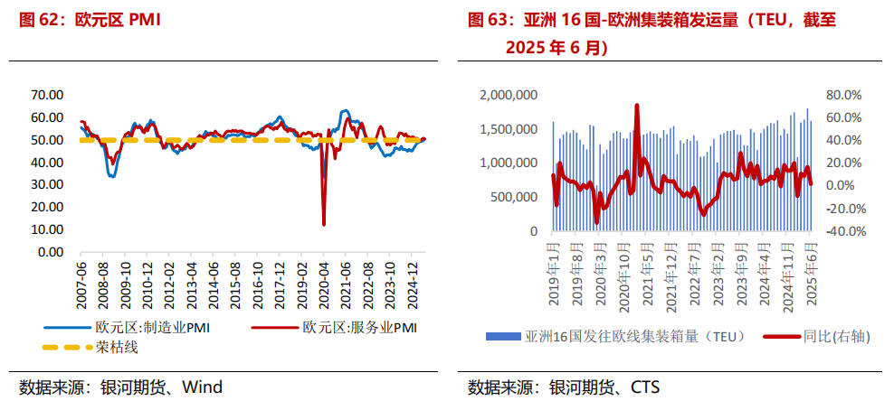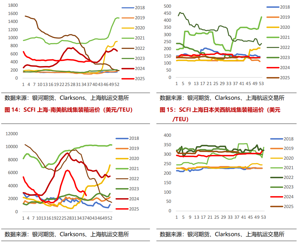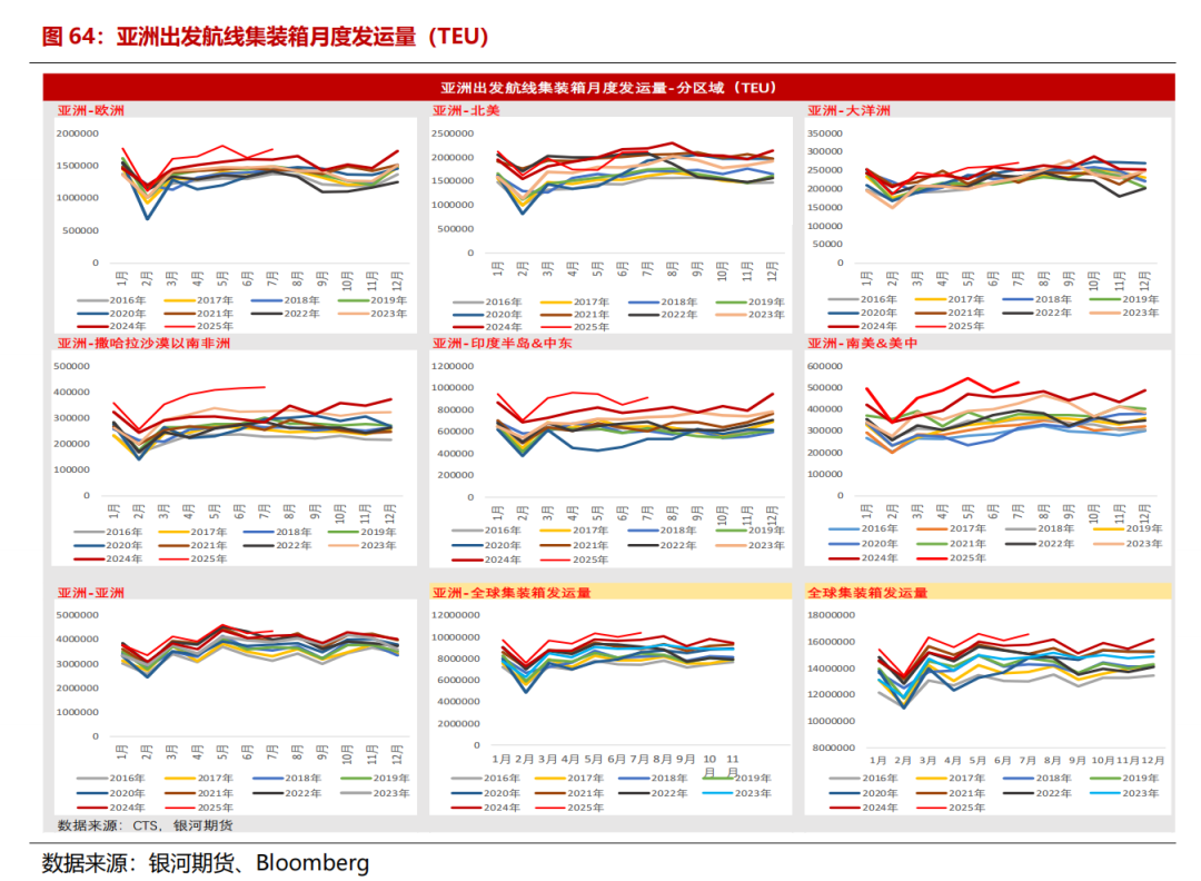 关税影响大家发运流向,好意思线及非好意思航路进展连续分化。从集装箱发运量来看,2025年7月,亚洲-欧洲集装箱的发运量为175.84万TEU,同比+10.1%,增速环比6月大幅加多8.7个百分比;7月亚洲-北好意思集装箱发运量为212.4万TEU,同比-3%,下降幅度较上月捏平。7月亚洲-大家集装箱的发运量为1035.5万TEU,同比+3.7%,增速环比6月加多6.8个百分点;7月大家集装箱发运量为1657.5万TEU,同比+5.1%,增速环比6月加多2.5个百分点。