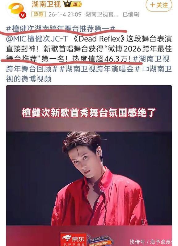 檀健次在湖南跨年晚会上被保举为第又名,热度值跳动46.3万,成了当晚最火的舞台。