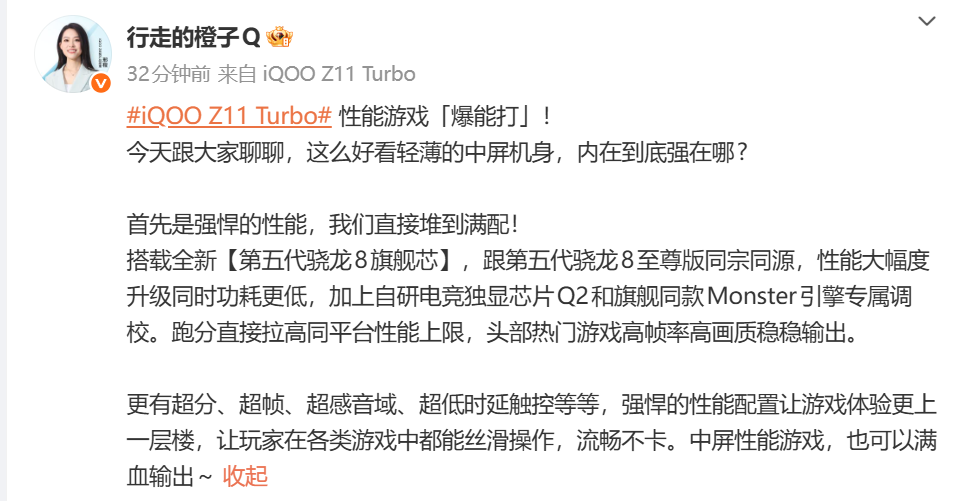 从预热信息看,iQOO Z11 Turbo在游戏体验上作念足著述:不仅维持超分、超帧期间,擢升画面通顺度与了了度,还具备超感音域与超低时延触控等功能,全面优化游戏操控与视听体验。官方称其“跑分奏凯拉高同平台性能上限”,有望成为同档位性能标杆。