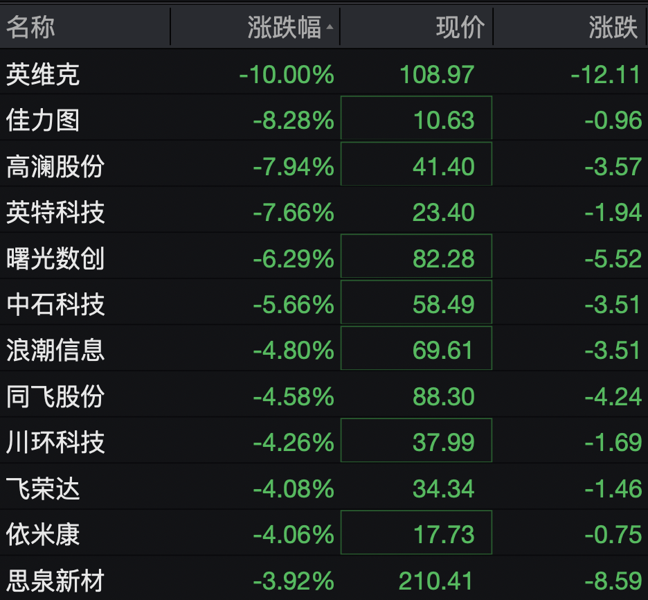 此外,佳力争跌超8%,高澜股份跌近8%,英特科技跌超7%,晨曦数创、中石科技、海潮信息、同飞股份等跌幅居前。